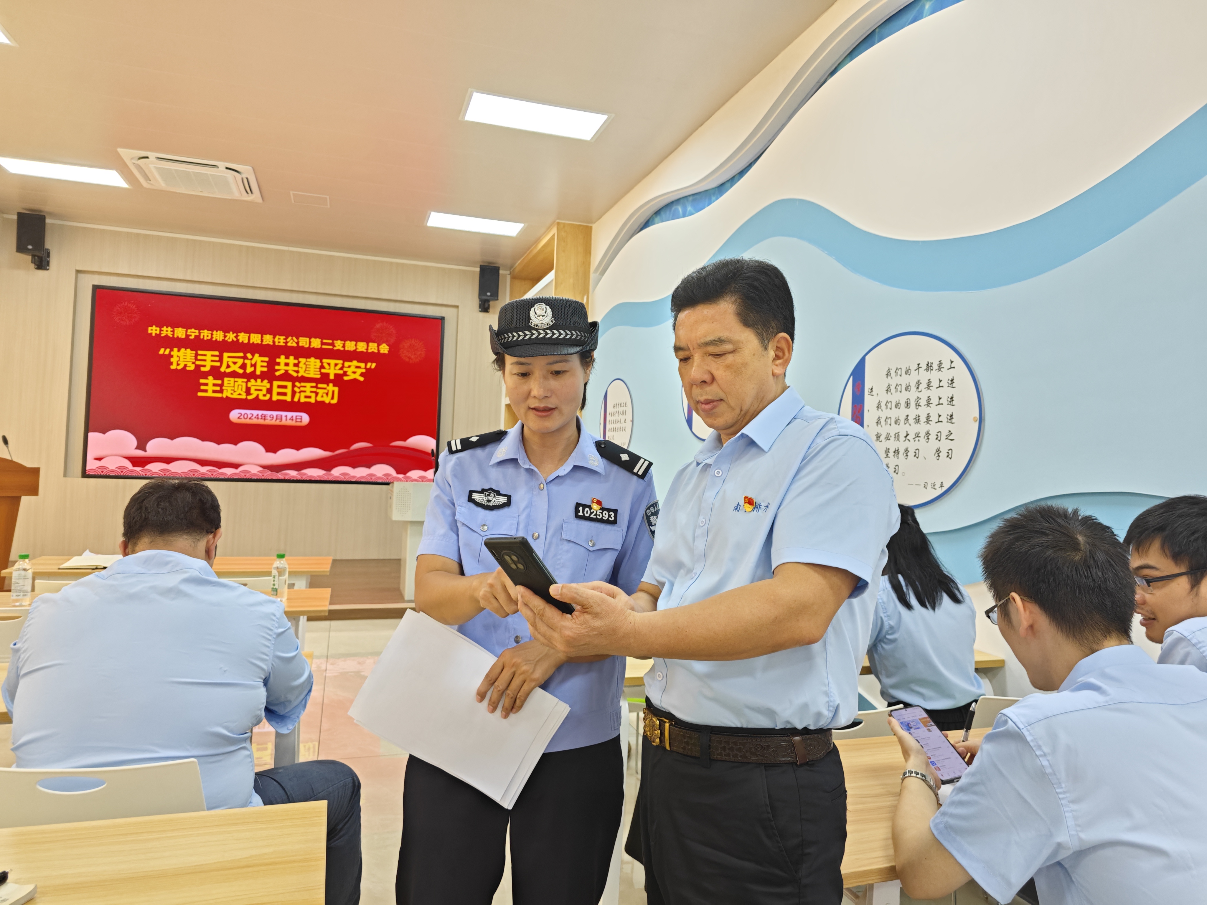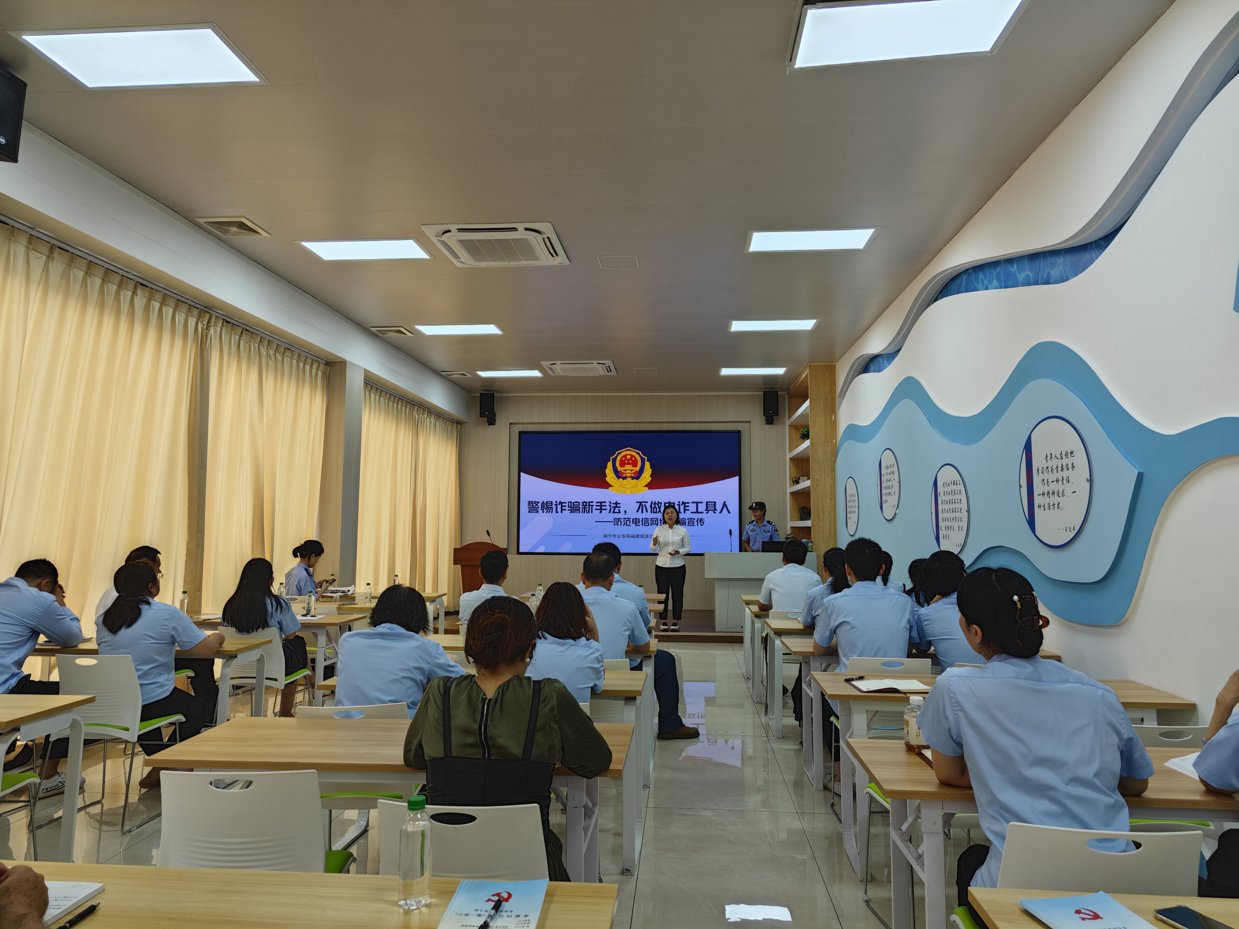 為進(jìn)一步提高黨員群眾對詐騙新手法的警惕性,積極引導(dǎo)黨員群眾主動(dòng)增強(qiáng)維護(hù)社會公德的意識,9月14日,市排水公司第二黨支部在集團(tuán)公司新時(shí)代文明實(shí)踐所新時(shí)代學(xué)習(xí)大講堂,開展了“攜手反詐 共建平安”主題黨日活動(dòng)?;顒?dòng)邀請南寧市公安局福建園派出所民警梁警官進(jìn)行防范電信網(wǎng)絡(luò)詐騙宣傳,市排水公司黨員群眾約50人參加活動(dòng)。