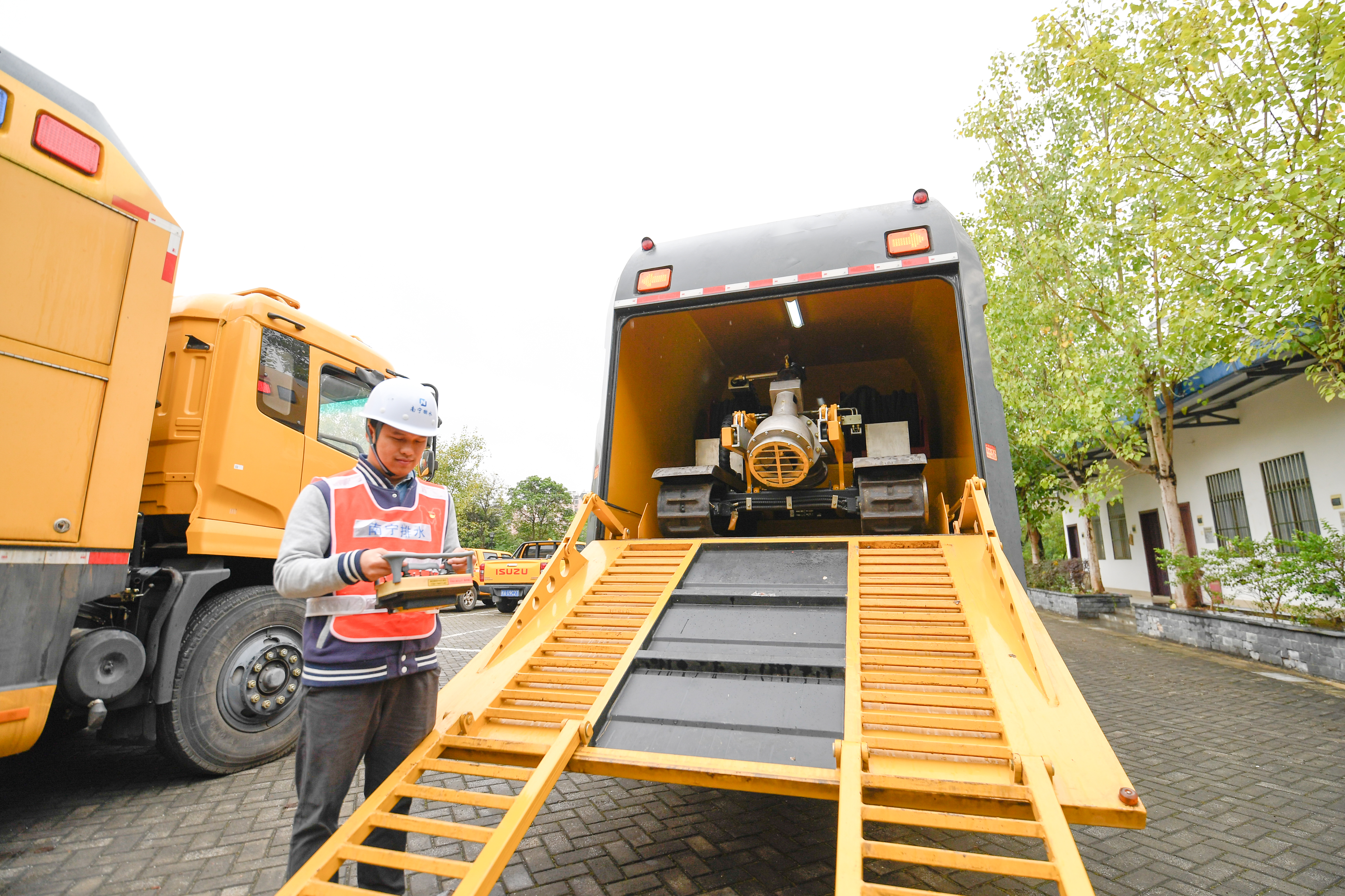 在市排水公司三美運維基地,工作人員在對防汛車輛進行設備檢查。